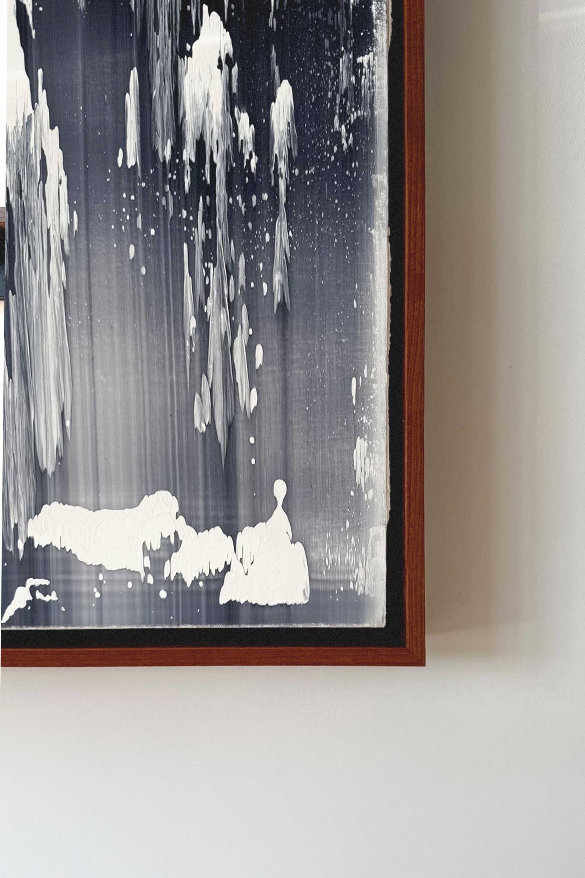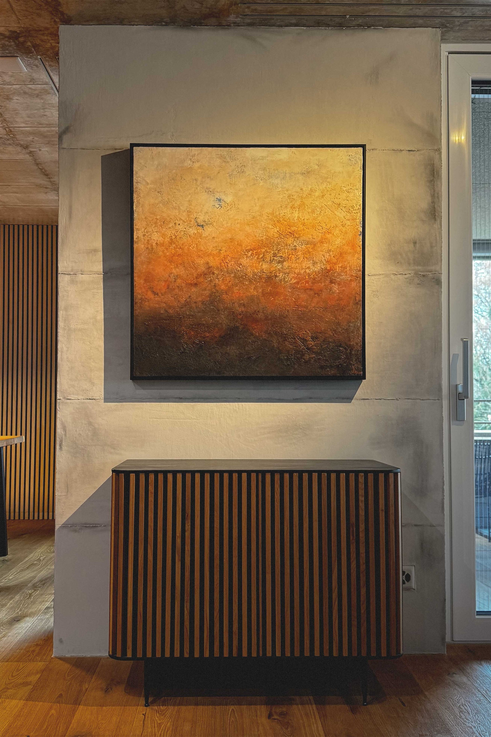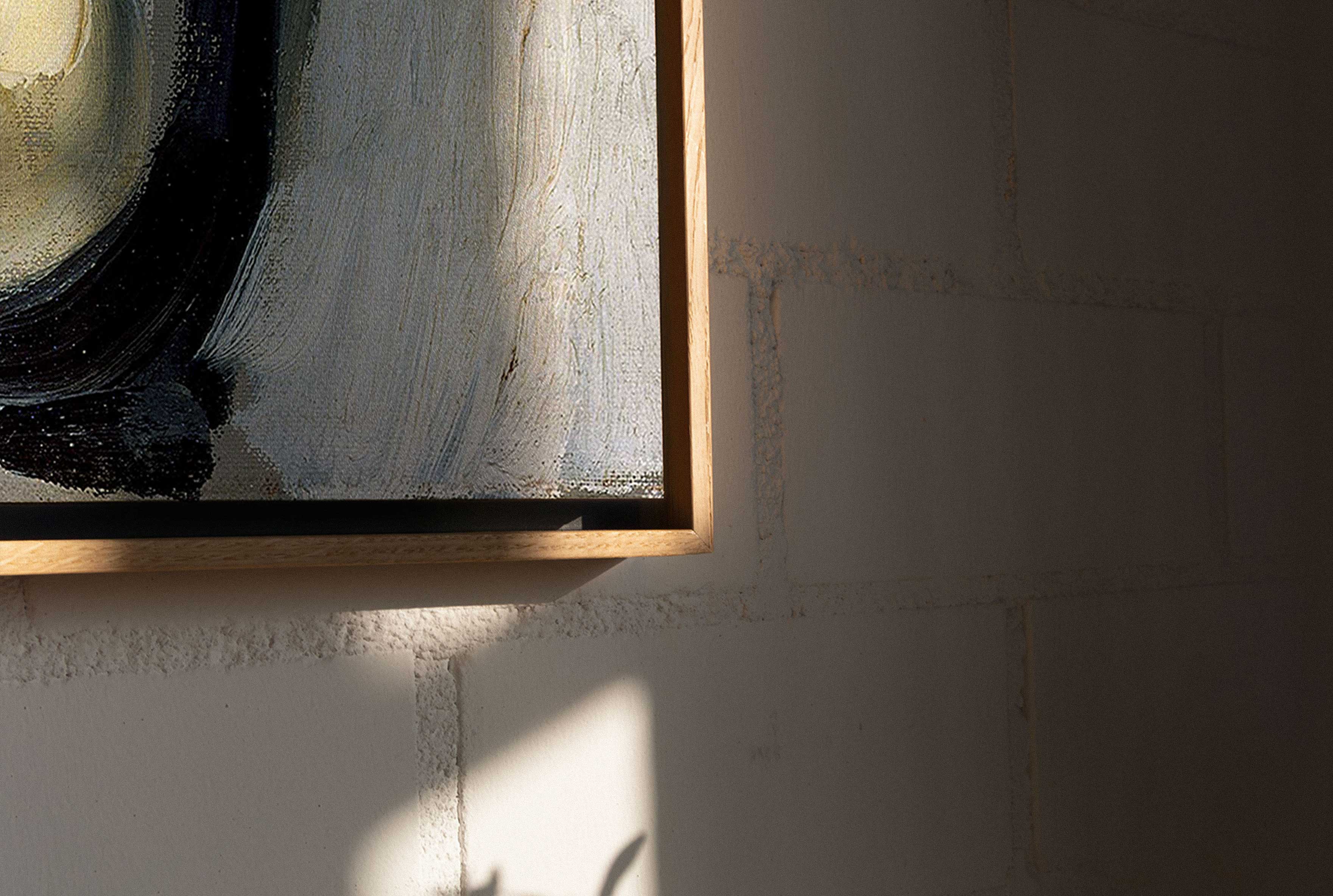 Die schwarze Basisleiste sorgt für eine dezente Tiefenwirkung und lässt das Bild optisch schweben. Sie betont die Schattenfuge und lenkt den Blick ganz auf das Kunstwerk – für eine edle, galerieähnliche Präsentation.